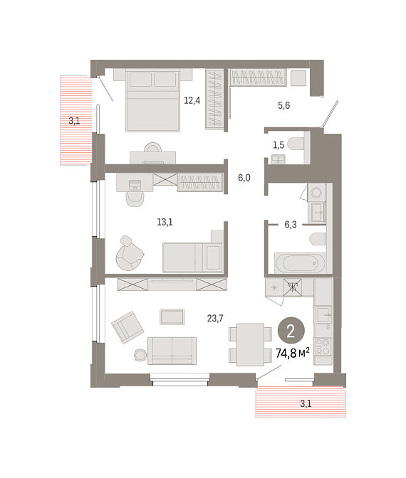 2К квартира 74,77 м²