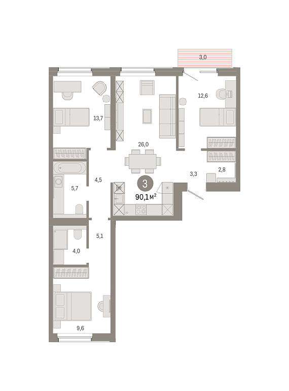 3К квартира 90,1 м²
