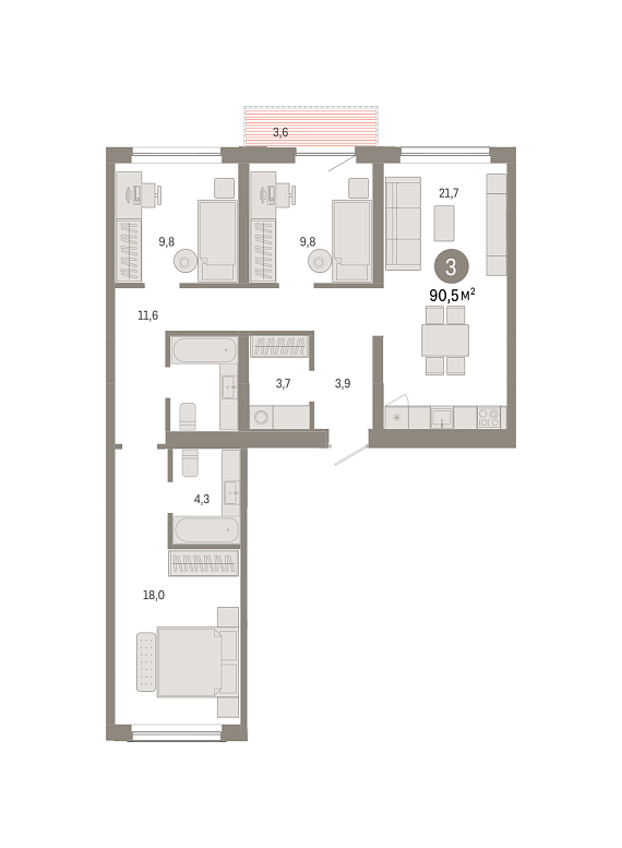 3К квартира 90,5 м²