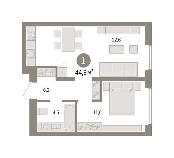 1К квартира 44,85 м²
