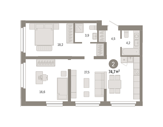 2К квартира 74,7 м²