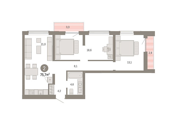 2К квартира 75,72 м²