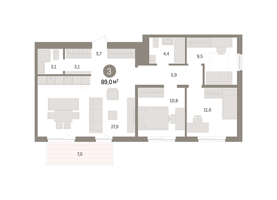 3К квартира 89 м²