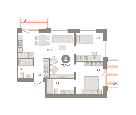 2К квартира 73,29 м²