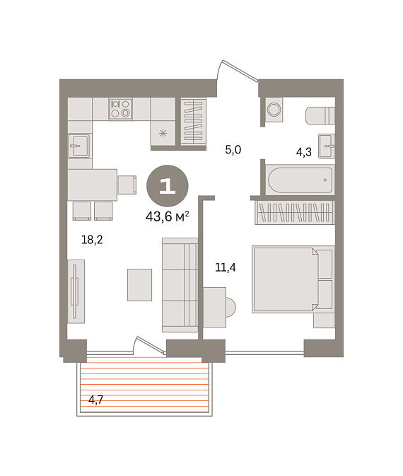 1К квартира 43,61 м²