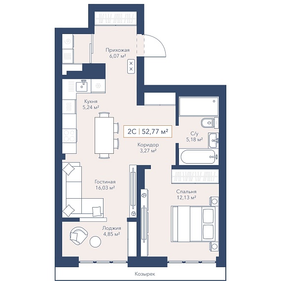 2К квартира 52,6 м²