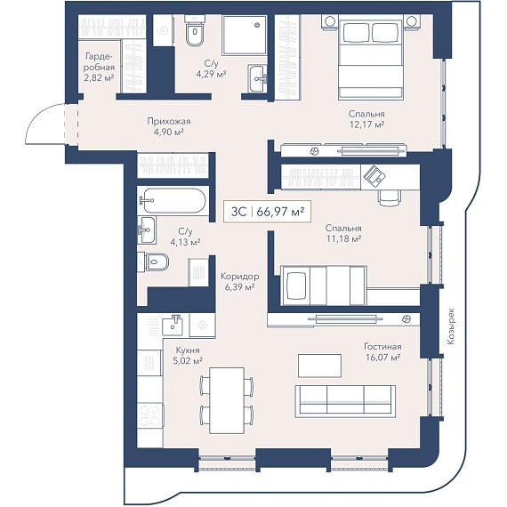 3К квартира 67,1 м²