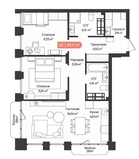 3К квартира 69,71 м²
