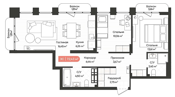 3К квартира 72,43 м²