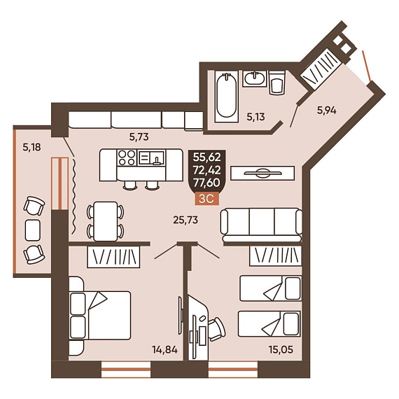 3К квартира 77,6 м²