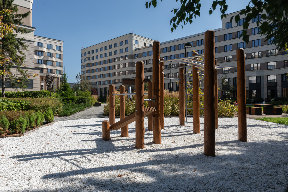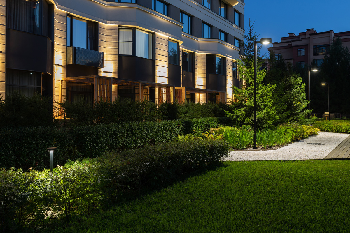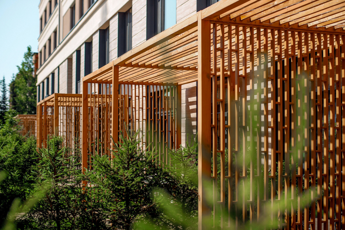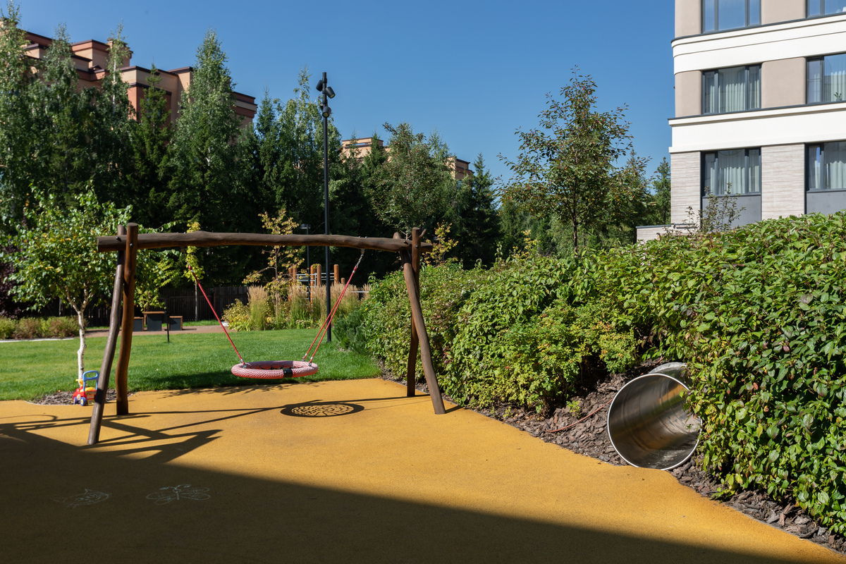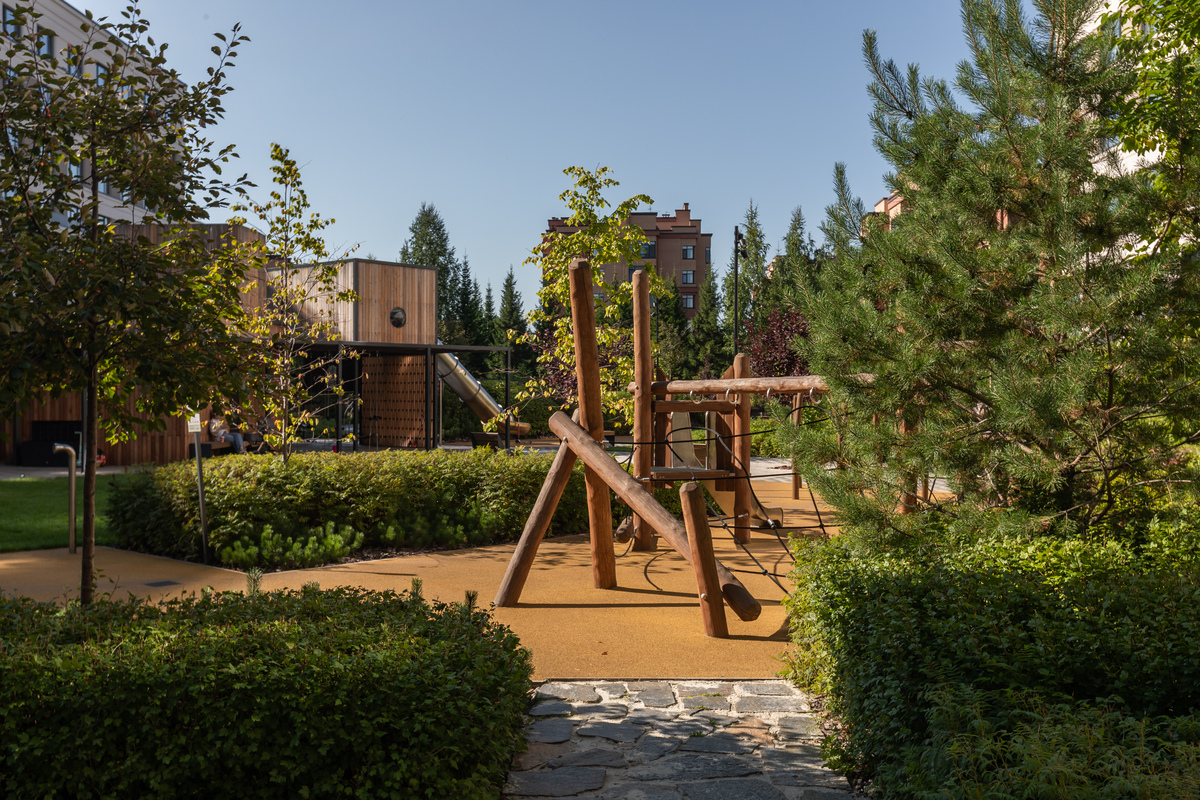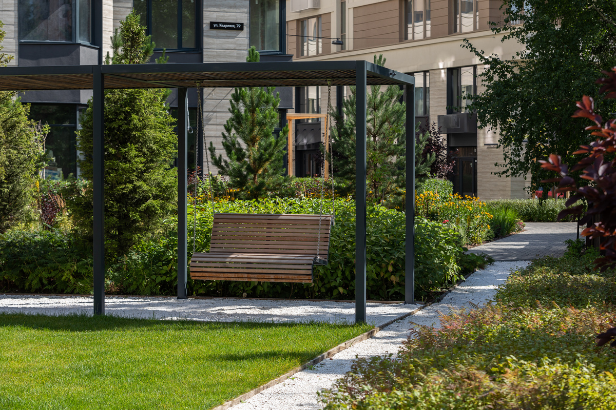 Благоустройство территории предполагает создание приватного двора-парка, где комфорт и функциональность переплетаются с искусством ландшафтного дизайна. Растения подобраны с учетом сезонного цветения — чтобы непрестанно радовать глаз новыми красками.