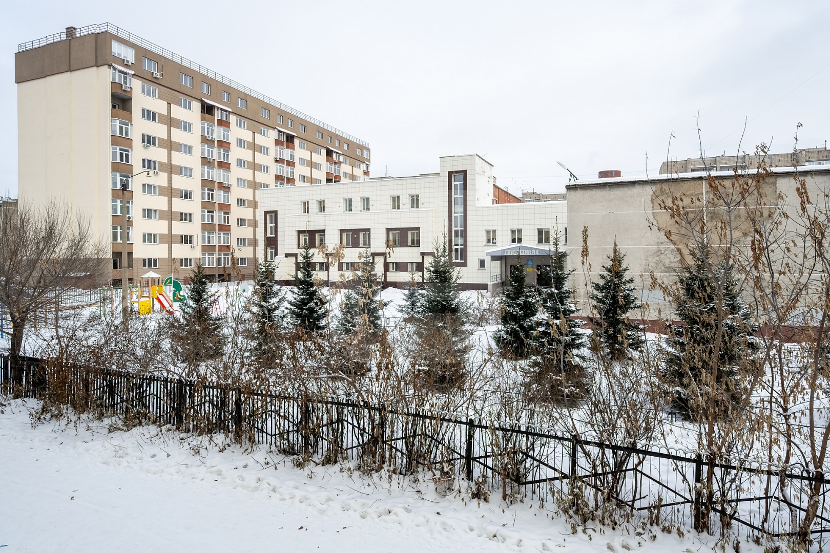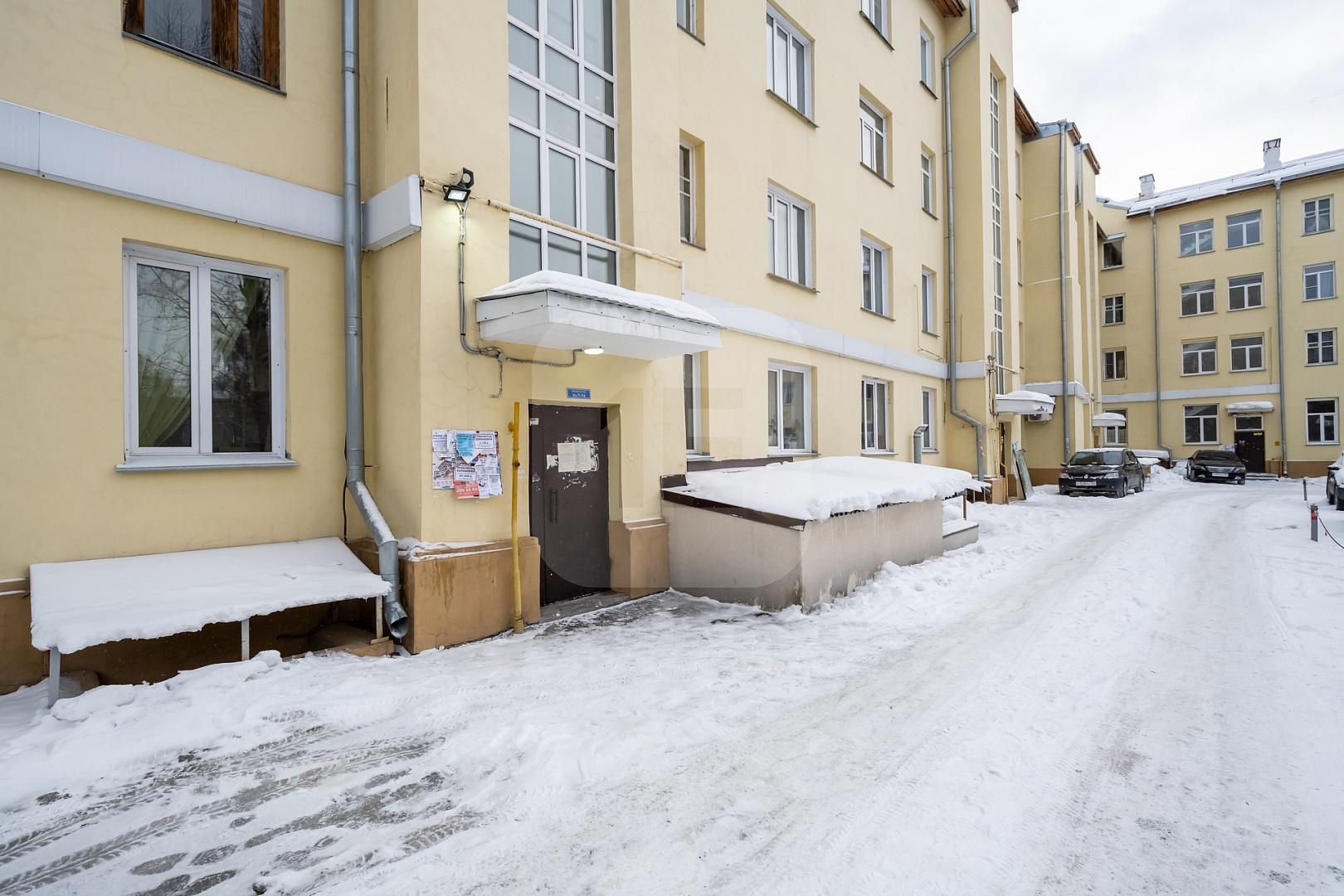 — Дом внутри квартала, защищён от шума магистралей; из окон — зелёный двор.